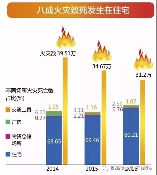 近十年全國(guó)共發(fā)生高層建筑火災(zāi)3.1萬(wàn)起,死亡474人,直接財(cái)產(chǎn)損失15.6億元。近三年來(lái),火災(zāi)致死發(fā)生在住宅的比例逐年升高,2016年有1269人在住宅火災(zāi)中死亡,占火災(zāi)致死總數(shù)的80.21%。